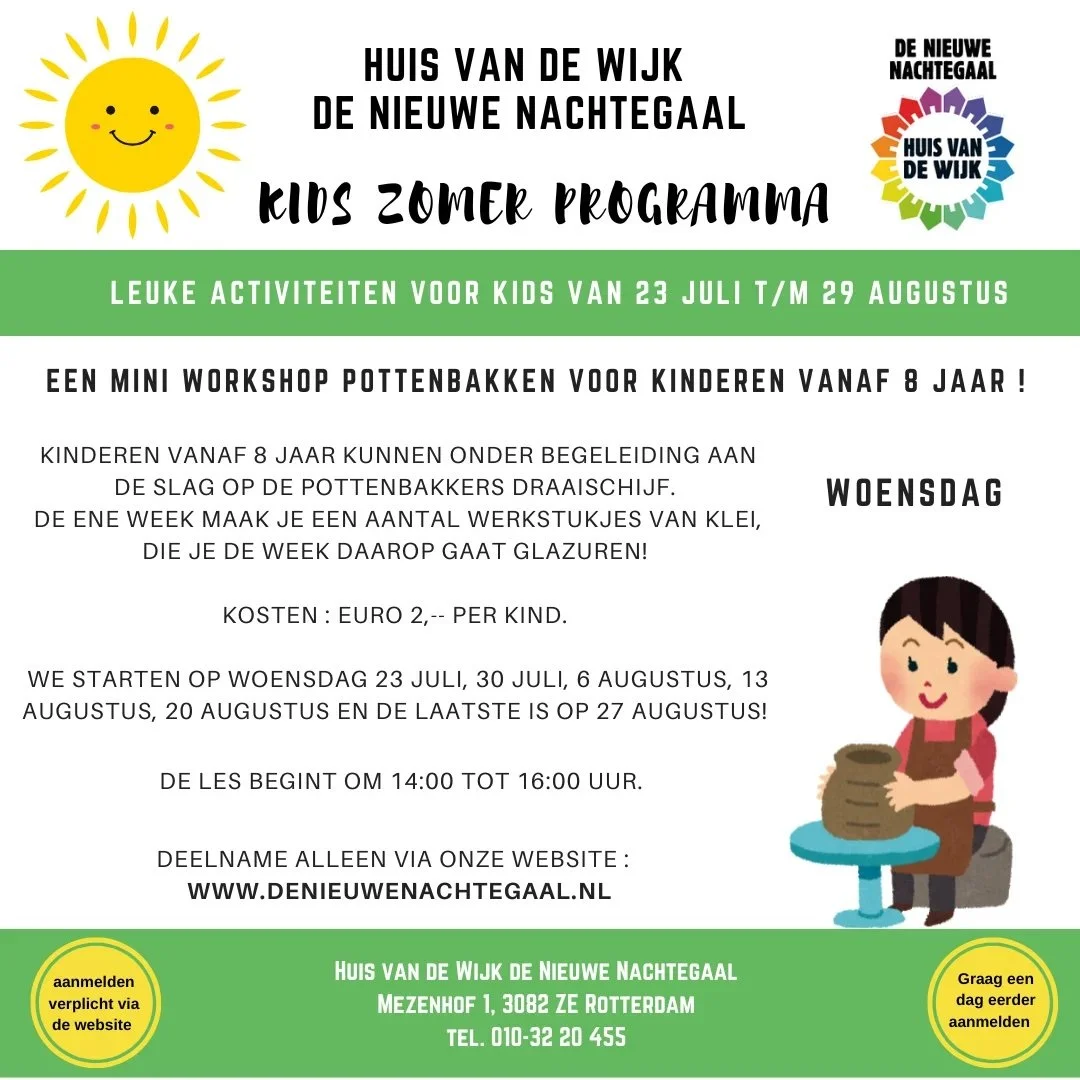 Mini Workshop Pottenbakken! woensdag 27 augustus 2025 14:00 16:00 Huis van de Wijk De Nieuwe Nachtegaal 27 Mezenhof Rotterdam, ZH, 3082 ZE Netherlands (kaart) Google Agenda ICS €2 per kind Aanmelden is verplicht