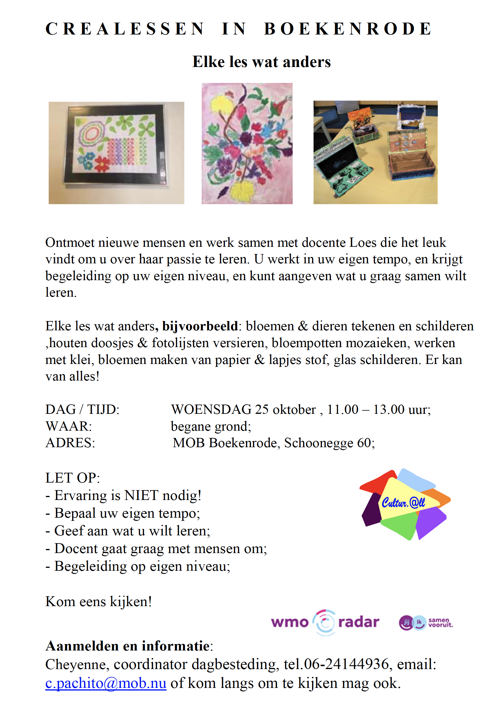 CREALESSEN IN BOEKENRODE woensdag 25 oktober 2023 11:00 13:00 MOB Boekenrode 60 Schoonegge Rotterdam, ZH, 3085 CX Netherlands (kaart) Google Agenda ICS