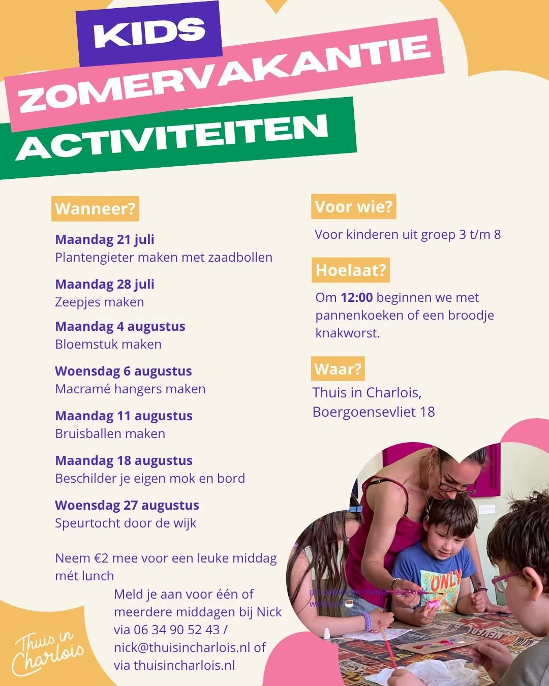 Voor alle kinderen uit groep 3 t/m 8 organiseert Thuis in Charlois deze zomer elke week een gezellige en creatieve middag â mÊt lunch! đĨđ đ Hoelaat? Om 12:00 beginnen we met pannenkoeken of een broodje knakworst đŊī¸
