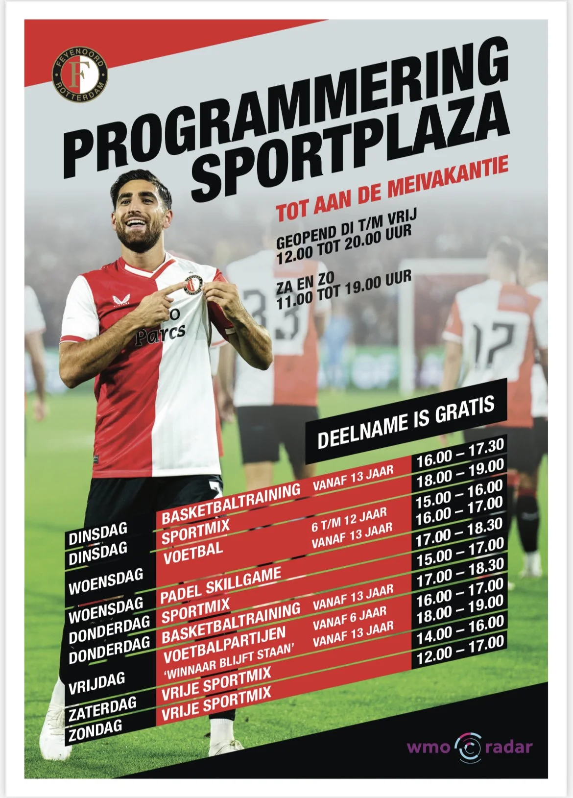 PROGRAMMERING SPORTPLAZA maandag 25 maart 2024 15:00 vrijdag 26 april 2024 19:00 Sportplaza Zuiderpark 21 Oldegaarde Rotterdam, ZH, 3084 AA Netherlands (kaart) Google Agenda ICS Gratis! TOT AAN DE MEIVAKANTIE